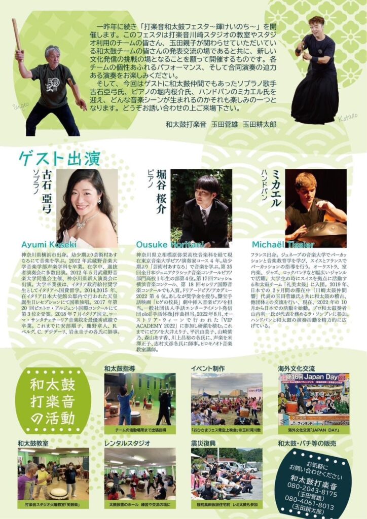古石亞弓が在籍した川崎太鼓仲間響の代表が運営する「打楽音」と多くの太鼓集団が打ち鳴らすフェスタに、ゲストとして出演した。