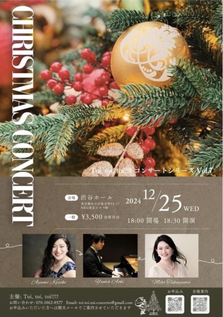 渋谷ホールにおいて小さなクリスマスコンサートを開いた。極々身近な方々への感謝も込めて。共演:高山美帆(ソプラノ)